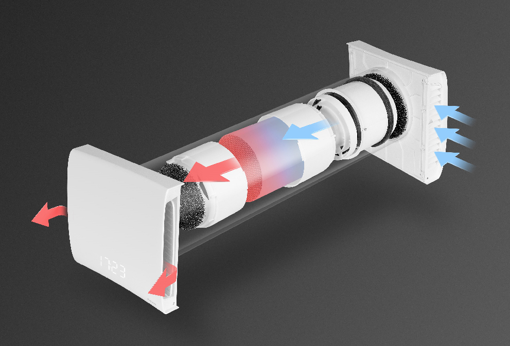 The heat accumulated in the exchanger is collected by the supply air stream and then transferred to the room. After the exchanger cools down, it automatically changes the direction of operation.