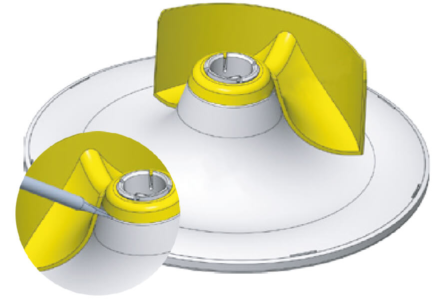 Produkt wyposażony jest w specjalną przepustnicę umożliwiającą nadawanie kierunku nawiewu powietrza. Takie rozwiązanie stosowane jest w sytuacjach, kiedy anemostat zainstalowany jest w pobliżu ścian lub elementów wyposażenia, na które nawiew powietrza może niekorzystnie wpływać.