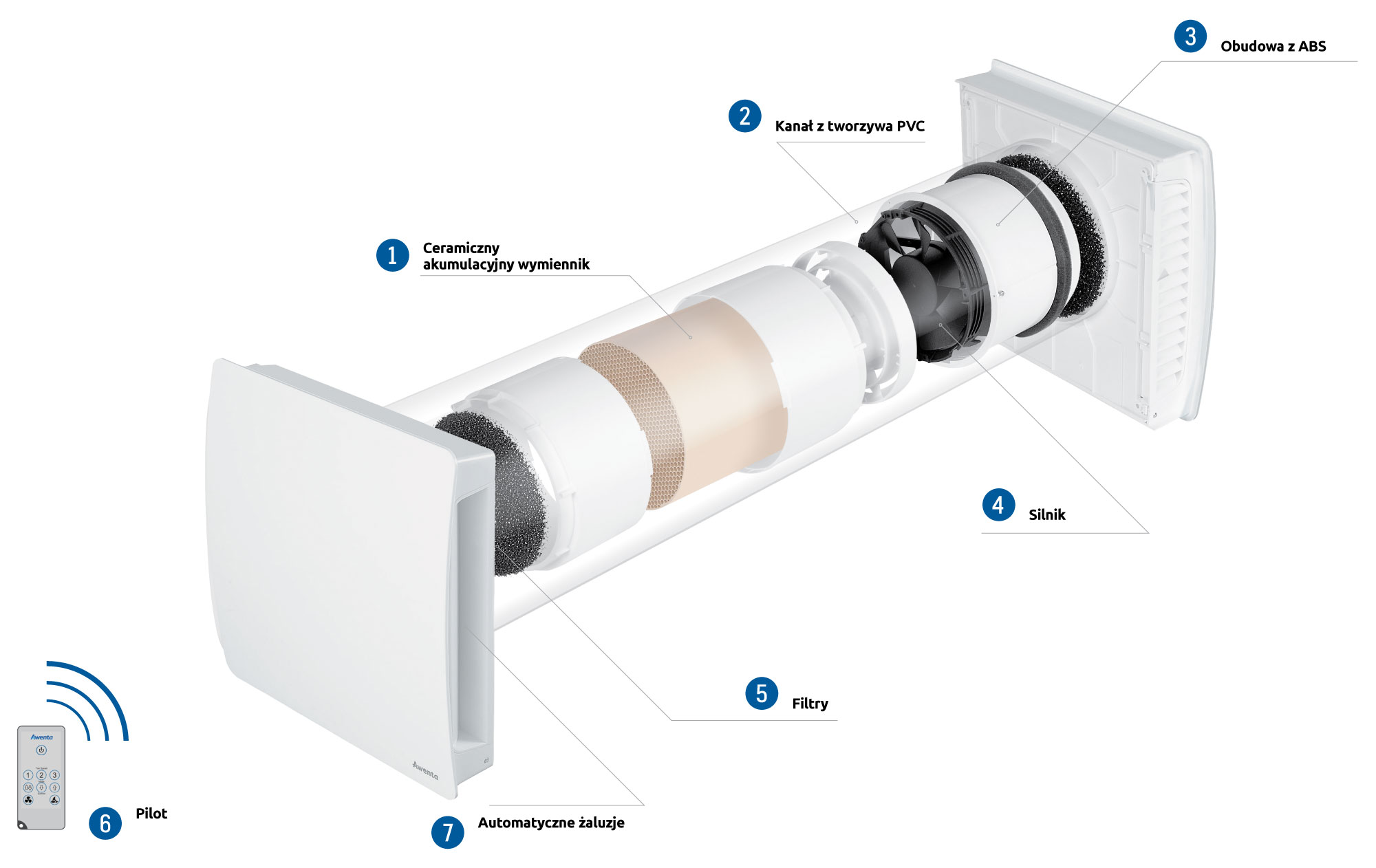 Podczas pracy w kierunku wywiewnym ciepło jest magazynowane w ceramicznym wymienniku. Po całkowitym nagrzaniu wymiennika następuje automatyczna zmiana kierunku pracy.