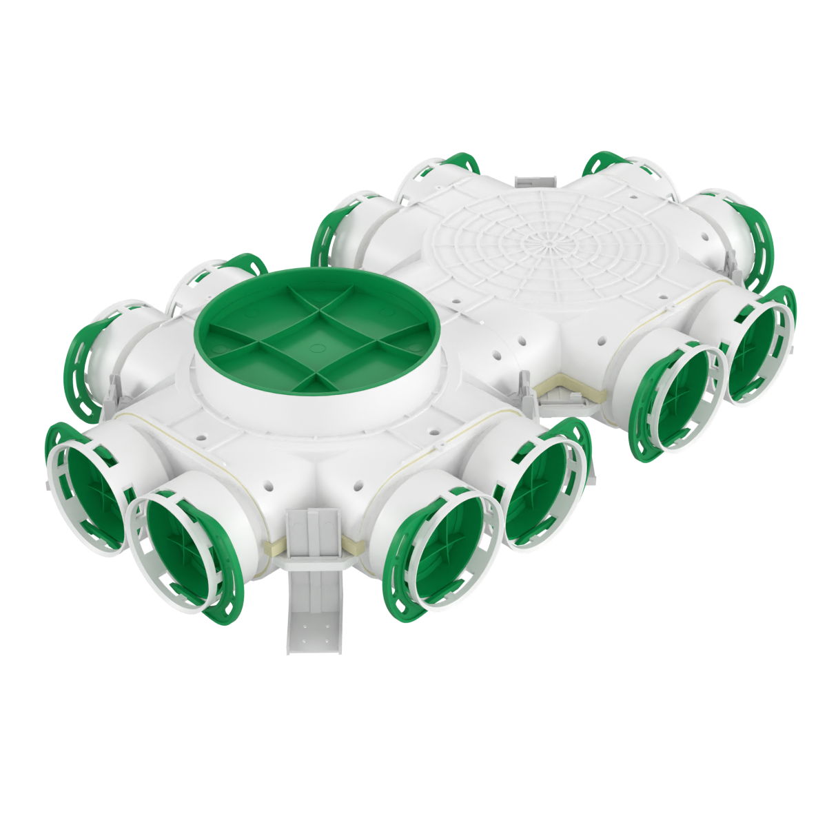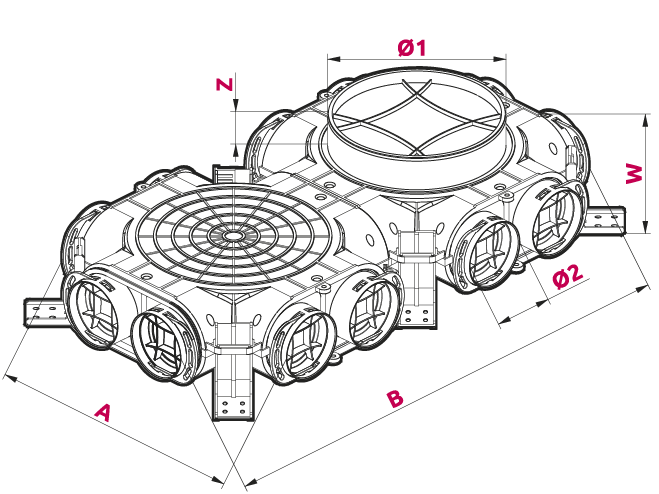Skrzynka rozdzielcza Awenta PRO VCB160-12/90 i VCB200-12/90 umożliwiają podłączenie do 12 kanałów wentylacyjnych Ø90 mm. Kanały nieużywane mogą zostać zamknięte dołączonymi do zestawu zaślepkami. Skrzynka występuje w dwóch konfiguracjach przyłącza do centrali Ø160 mm oraz Ø200 mm.