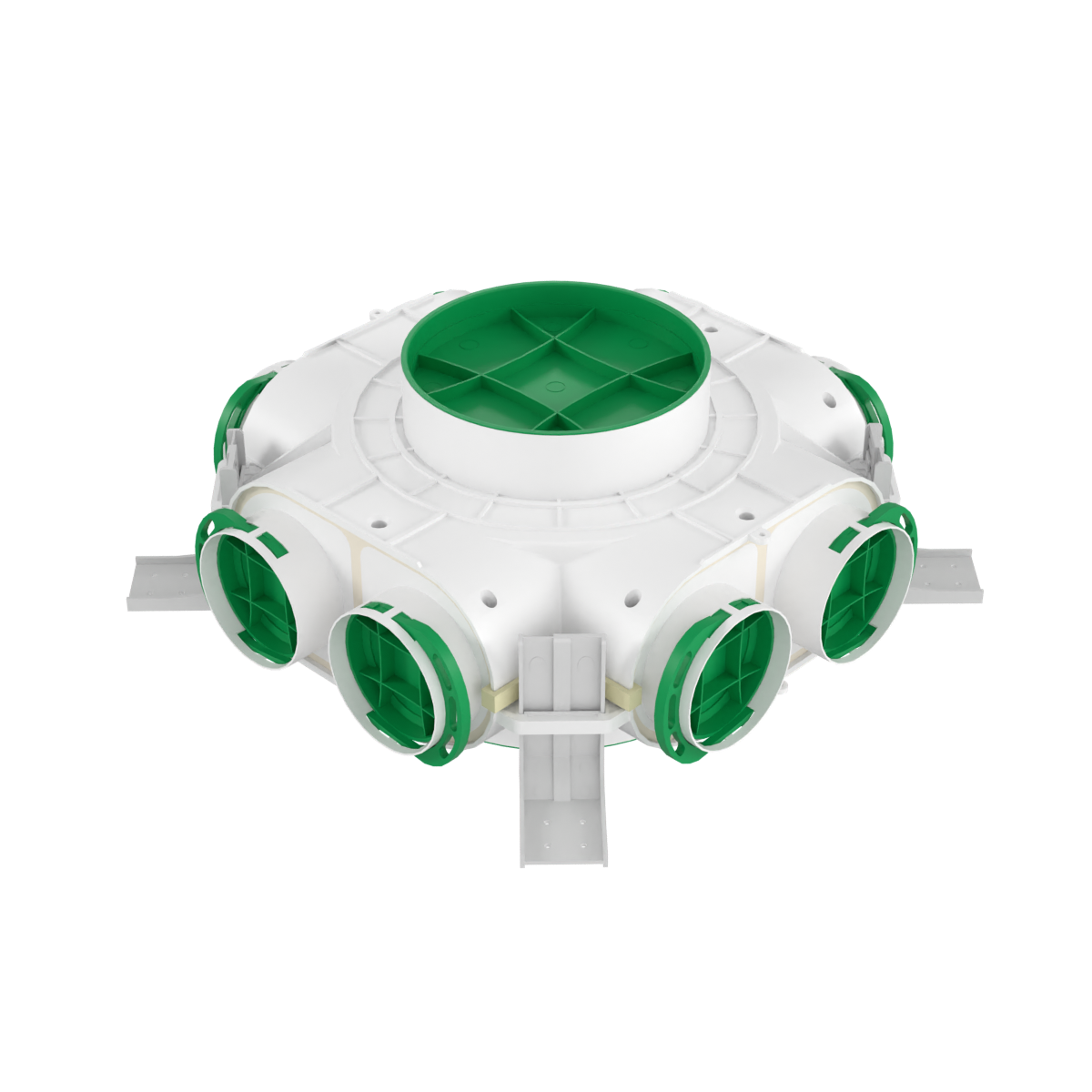 Skrzynka rozdzielcza przelotowa VCB160/200-8 Awenta PRO jest przeznaczona do rozprowadzenia strumienia powietrza pomiędzy dwoma kondygnacjami. Kanał przelotowy Ø 160 / Ø 200 mm służy przepływowi powietrza na następną kondygnację budynku, natomiast kanały Ø75 mm umożliwiają podłączenie do 8 kanałów wentylujących pomieszczenia na niższej kondygnacji. Regulację przepływu powietrza między kondygnacjami dokonuje się na anemostatach. Dodatkowo można zastosować przepustnicę zamontowaną przed wlotem do skrzynki rozdzielczej na wyższej kondygnacji. Kanały nieużywane mogą zostać zamknięte dołączonymi do zestawu zaślepkami z uszczelkami. Skrzynki AWENTA PRO wyposażone są w opatentowany system mocowania umożliwiający precyzyjną regulację odległości skrzynki od płaszczyzn zamontowania oraz pozwala w prosty sposób na demontaż skrzynki jeżeli zajdzie taka potrzeba. Niezależnie regulowane wsporniki umożliwiają poziomy montaż urządzenia, dając również możliwość jego pochylenia.