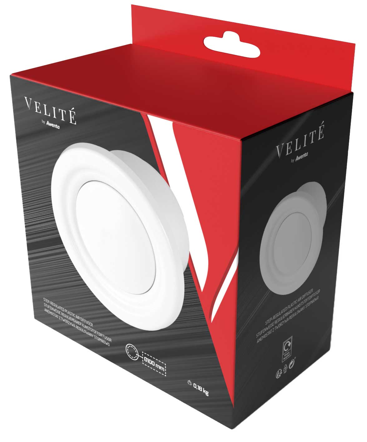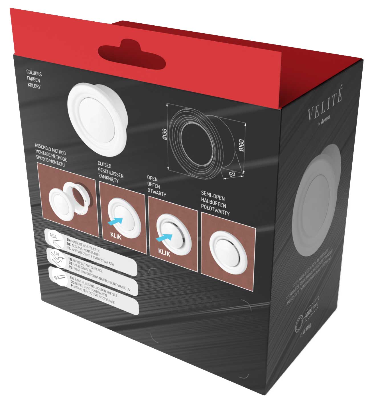 Anemostaty, tak jak pozostałe produkty z tworzywa w marce Velité, wykonane są z surowca ASA charakteryzującego się podwyższoną odpornością na promieniowanie UV.