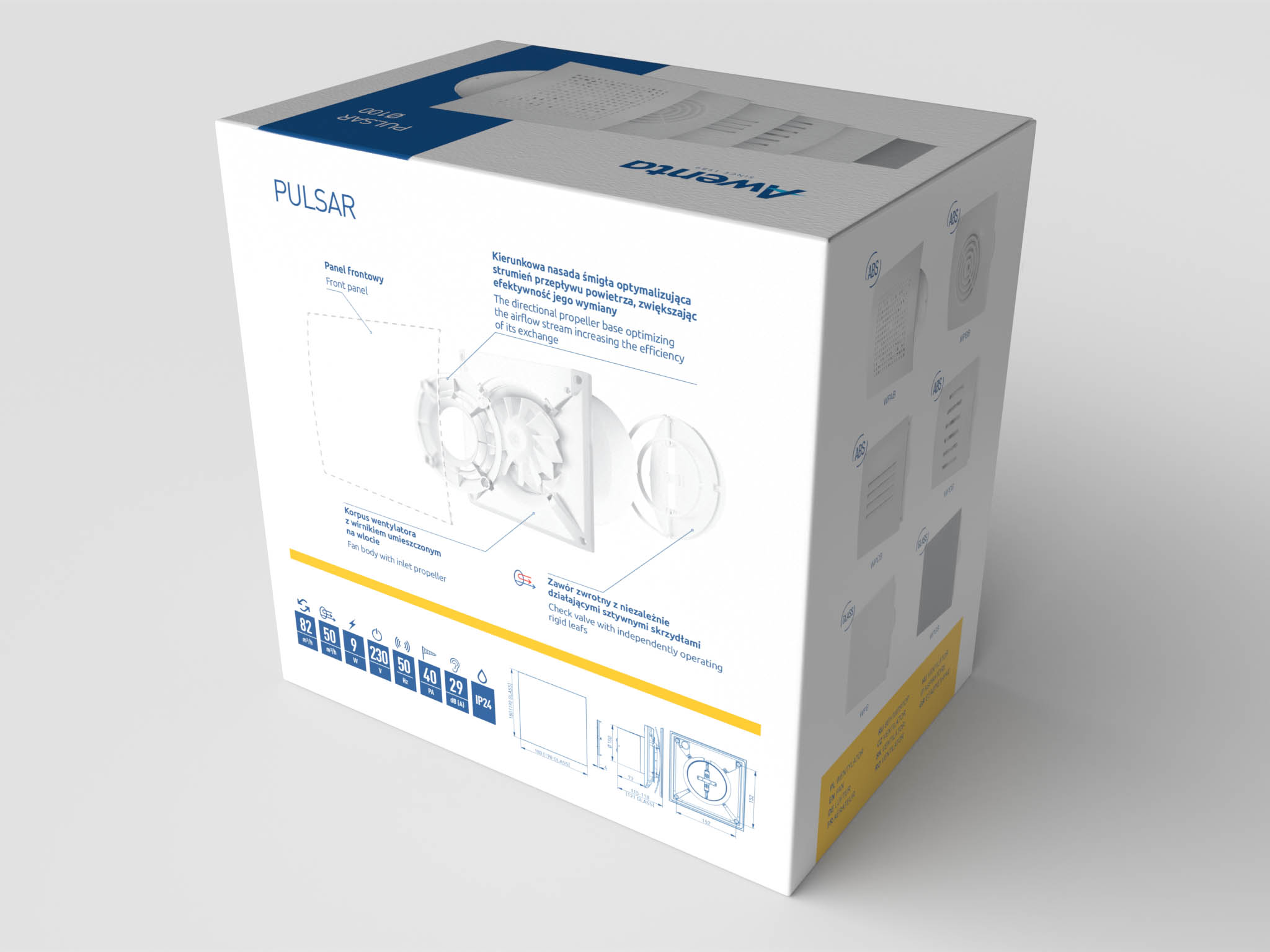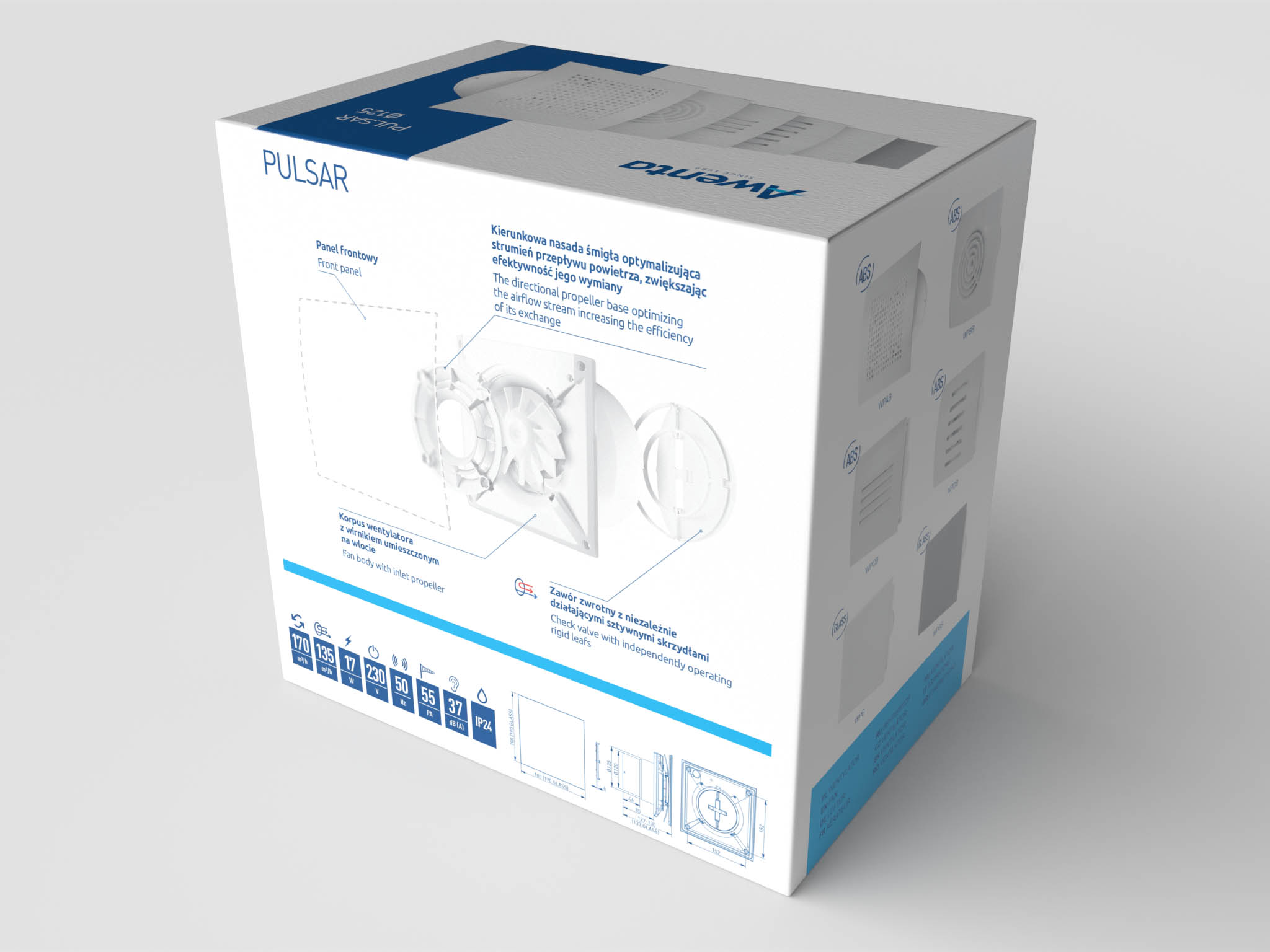 Zastosowany silnik, przednie umieszczenie śmigła oraz jego kształt pozwalają na wytworzenie wysokiego ciśnienia strumienia powietrza. Specjalnie zaprojektowana komora na sterownik umożliwia łatwe podłączenie wentylatora do sieci elektrycznej. W wentylatorach serii PULSAR, funkcje timera i higrostatu wzbogacone są dodatkowo w opcję umożliwiającą włączenie opóźnienia czasu uruchomienia (2 minuty).