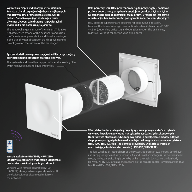 Rekuperacja daje możliwość ograniczenia strat ciepła spowodowanych wentylacją pomieszczenia. Zadaniem rekuperatora jest więc odzysk ciepła z powietrza wywiewanego z pomieszczenia, w którym jest zainstalowany. Urządzenie serii HRV wyposażone jest w akumulacyjny wymiennik ciepła, który zatrzymuje i gromadzi energię cieplną, by przekazać ją do powietrza nawiewanego z zewnątrz. Dzięki takiemu rozwiązaniu możliwa jest wymiana świeżego powietrza o temperaturze zbliżonej od temperatury panującej w pomieszczeniu.